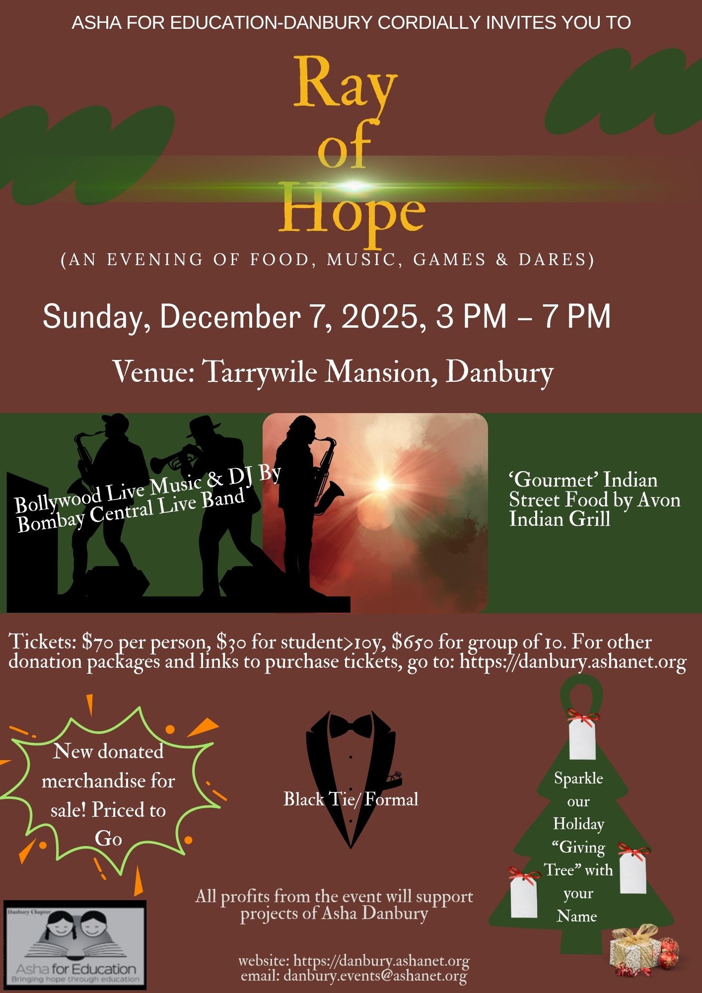 We would like to invite you to our Ray of Hope event to be held on Sunday, December 7, 2025 at the Tarrywile Mansion in Danbury, CT. The event will feature an elegant evening with a reception, games & dares, live bollywood music with DJ, and gourmet version of Indian street food. The evening will be a place for us to connect to a shared vision of Hope and contribute to a real change. This year, we will display our “Holiday Giving Tree” at the venue, where we will showcase the names of our attendees/donors. If you are unable to attend, please consider adding a sparkle to the Holiday Giving Tree.